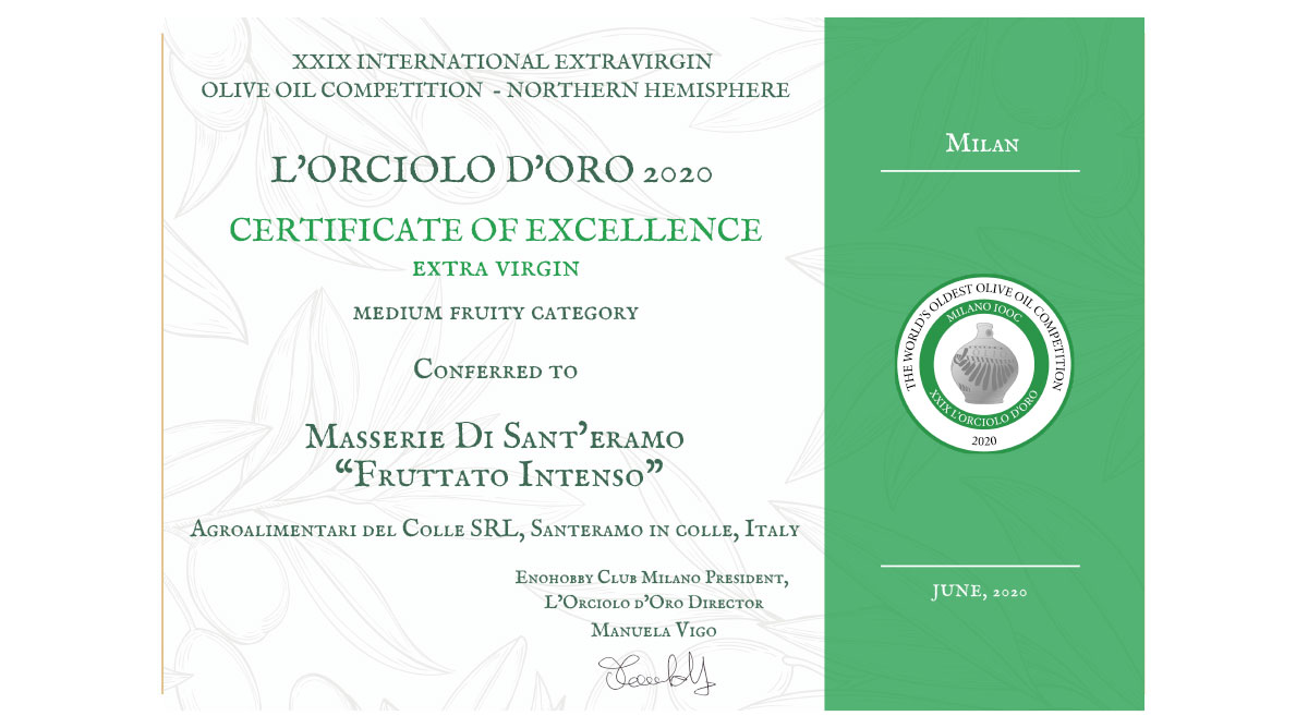 ORCIOLO D’ORO 2020 – Certificate of Excellence, Fruttato Intenso